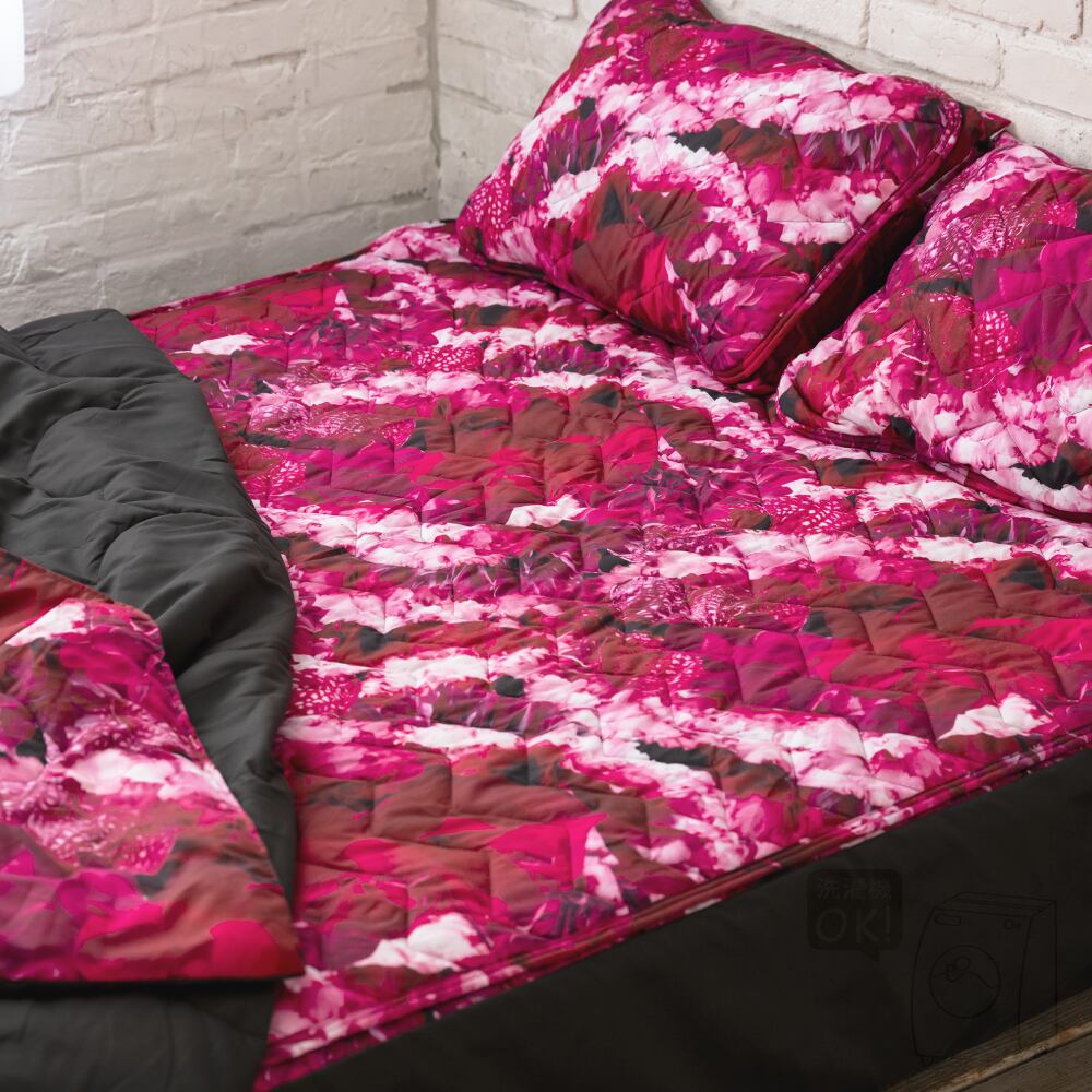 生地表面にピーチスキン加工を施しており、滑らかでスルッとした心地よい肌触りに程良いクッションの綿入りキルティング。表はプリント柄、裏は無地カラーをリバーシブルで使えるタイプです。シングル、セミダブル、ダブルの3サイズ展開。